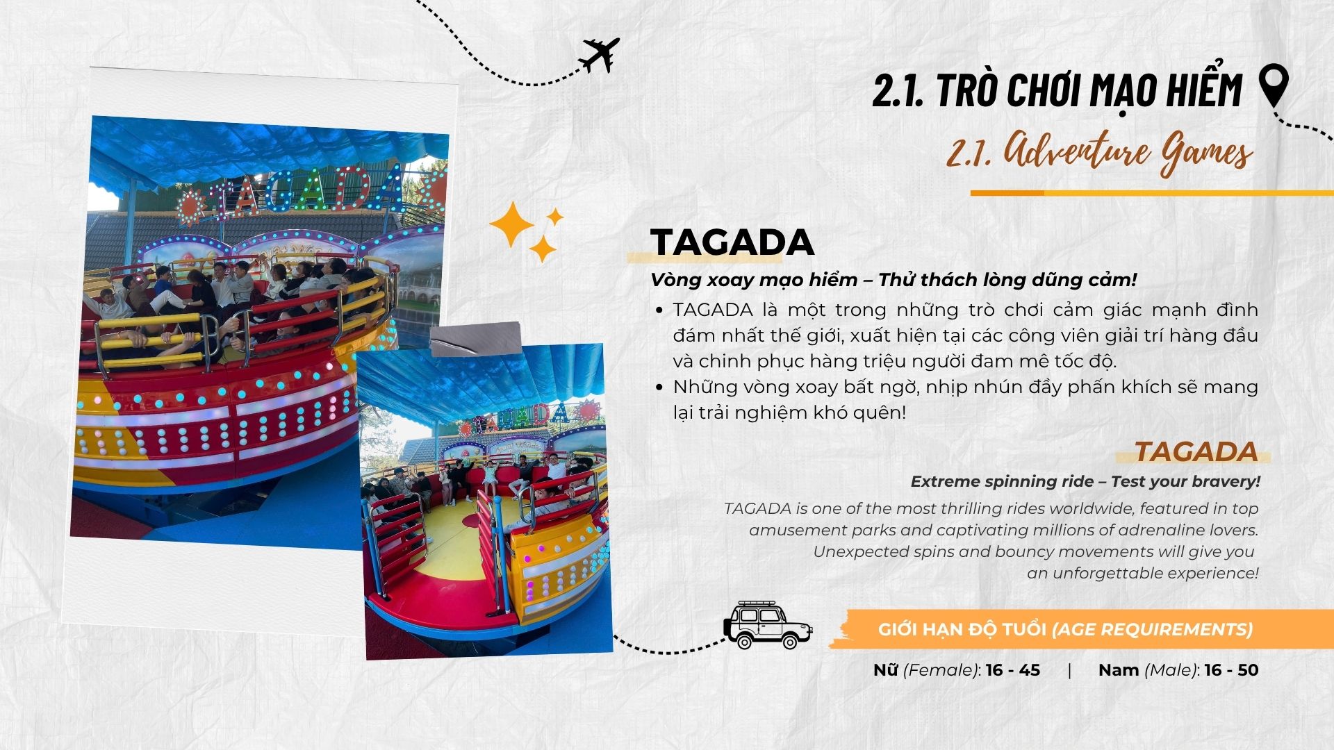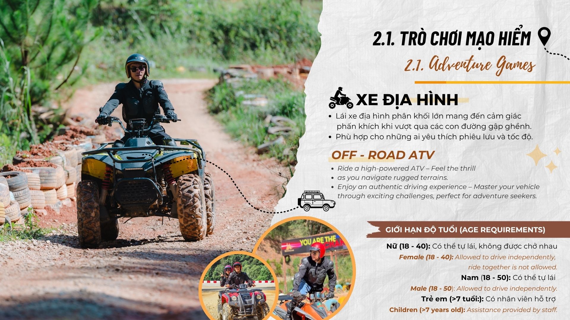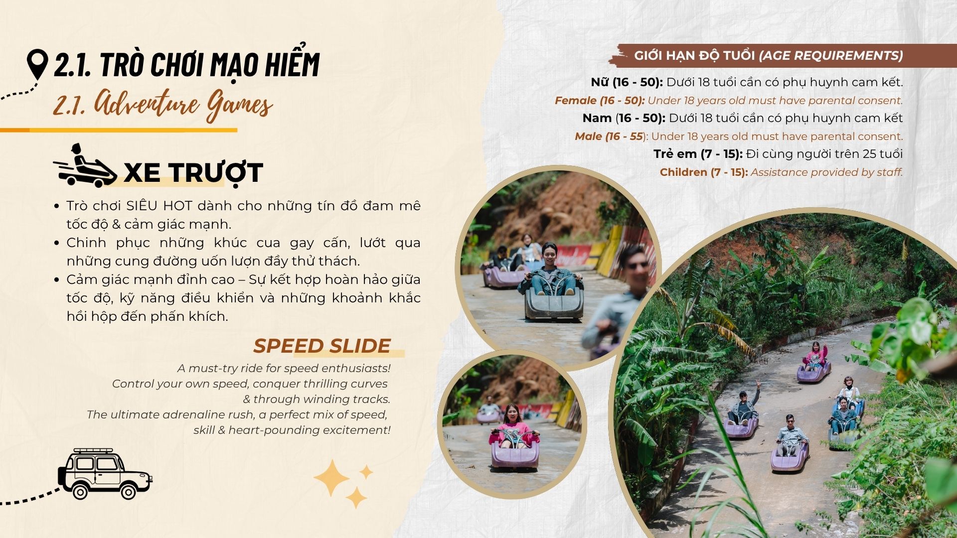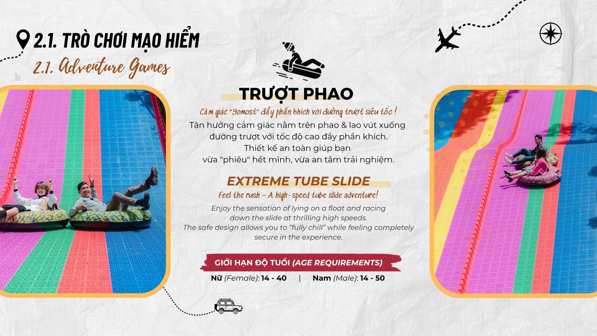 Hướng dẫn sử dụng trò chơi bằng tiếng Việt và Anh. Dữ liệu từ user manuals cho thấy 95% du khách hiểu rõ. Do đó, giảm rủi ro tai nạn.