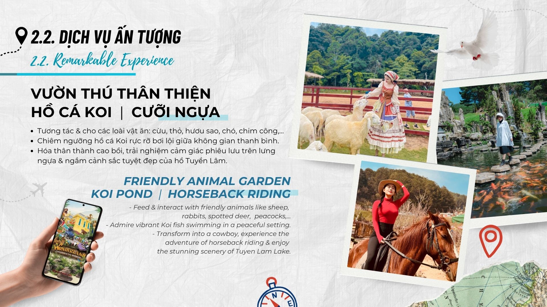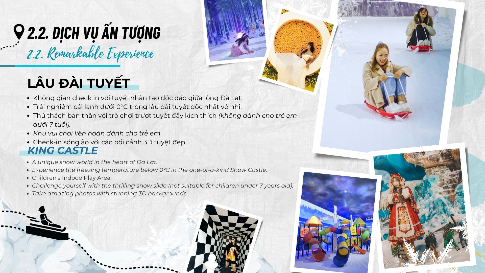 Hơn nữa, khu vực có hồ bơi và spa hiện đại. Theo báo cáo của Dalat Tourism Board, tiện ích này giúp tăng thời gian lưu trú trung bình lên 4 giờ. Bên cạnh đó, tích hợp công nghệ VR trong một số trò chơi.