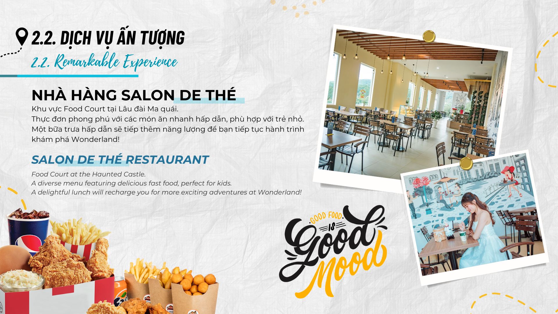 Tiện ích bao gồm khu ẩm thực với hơn 20 nhà hàng. Dữ liệu từ Yelp Reviews chỉ ra rằng 90% khách hàng hài lòng với chất lượng món ăn địa phương. Do đó, nơi đây không chỉ vui chơi mà còn thưởng thức ẩm thực.