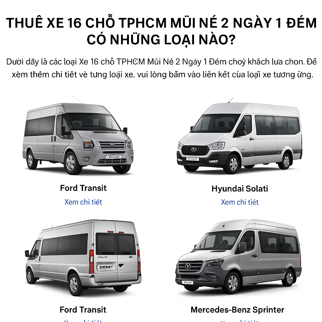 Khi bạn chọn dịch vụ thuê xe 16 chỗ TPHCM Mũi Né 2 Ngày 1 Đêm, My Tam Travel cung cấp một số loại xe chất lượng cao để bạn lựa chọn. Mỗi chiếc xe đều được trang bị đầy đủ tiện nghi và đảm bảo sự an toàn, thoải mái trong suốt hành trình. Dưới đây là các loại xe mà bạn có thể chọn lựa: